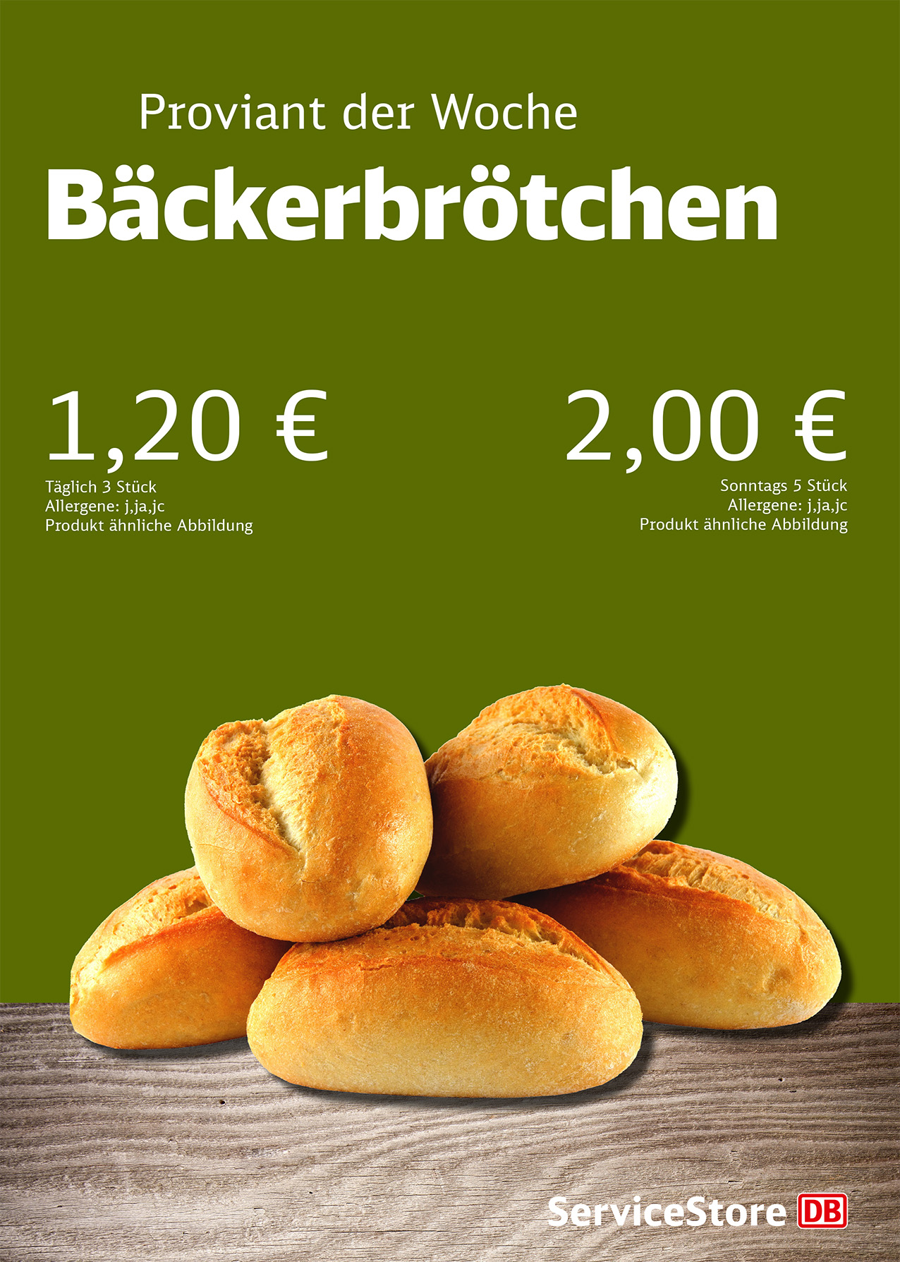 In unseren Snack-Filialen erhalten Sie täglich 3 Bäckerbrötchen zum Preis von 1,20 €. Am Sonntag bekommen Sie 5 Bäckerbrötchen für 2,00 €.