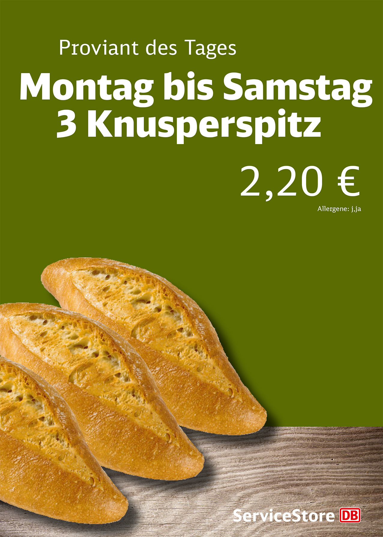In unseren Snack-Filialen erhalten Sie von Montag bis Samstag 3 Knusperspitz für nur 2,20 €.